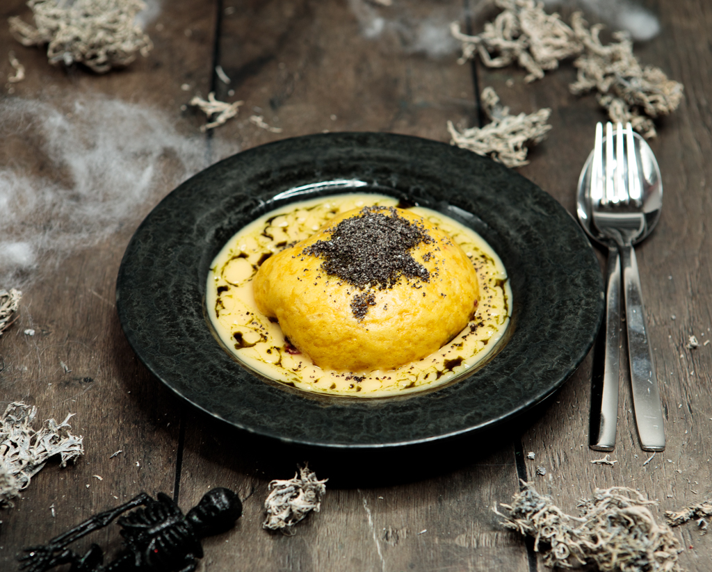 Den Mohn mit etwas Staubzucker vermischen. Mit etwas Kürbiskernöl den Germknödel leicht bepinseln und darauf die Mohn-Zuckermischung verteilen.